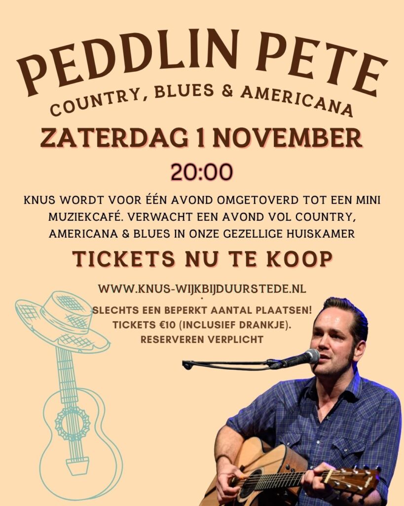 Beleef een intieme muzikale avond bij Knus met Peddlin Pete! Geniet van country, blues & americana in onze knusse huiskamer.